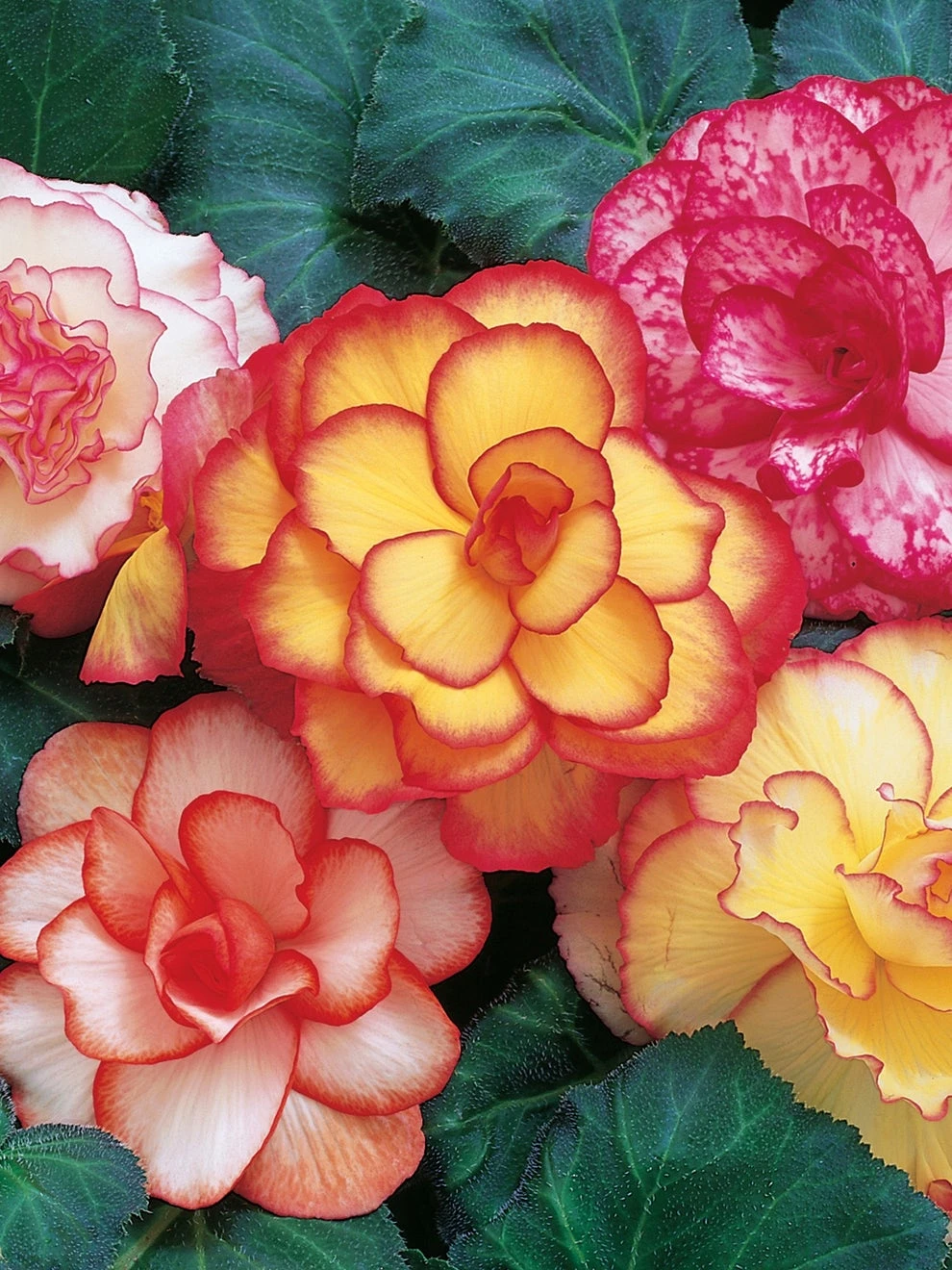 Dazzling rose-like picotees in red, golden-yellow and white. Spectacular in patio planters, showy from July until frost.