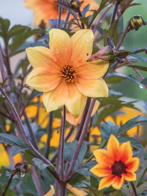 There’s a fresh fashionable passion for dahlias, the classic, beloved ornamental beauty. Stunning new dahlias, in vivid cool hues, are lovely additions to the color palette. Vigorous compact plants ignite a non-stop blaze of long-stemmed blooms all summer and into the fall. Stunning dark purple-black foliage prettily counterpoints the starry orange blooms with expressive golden-brown eyes. Creates visual chamber music in the border or in your patio container of choice. Long-stemmed, 18-36″ tall beauties dazzle as cut flowers. Plants tolerate heat and show admirable resistance to mildew. Deadheading will encourage additional blooming. .