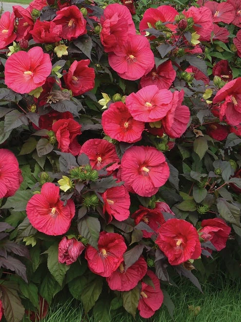 Huge, 9″ magenta red flowers proliferate from plants top to bottom. Large, dark-olive, copper tinted, billowing maple-like leaves make for impressive foliage. Native cultivar quickly develops an appreciative following of butterflies and hummingbirds. Each individual flower is in bloom for only one day, but one or more flowers usually open each day, in succession, over a long mid-summer to early fall bloom period.